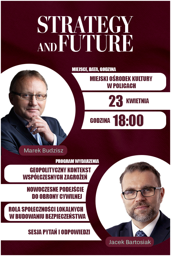 The Municipal Cultural Center in Police invites you to a unique meeting with Jacek Bartosiak and Marek Budzisz, recognized experts in geopolitics, strategy and security. The topic of the conversation will be Modern Civil Defense - a key issue in the face of dynamic changes in the world and growing challenges to Poland's security.