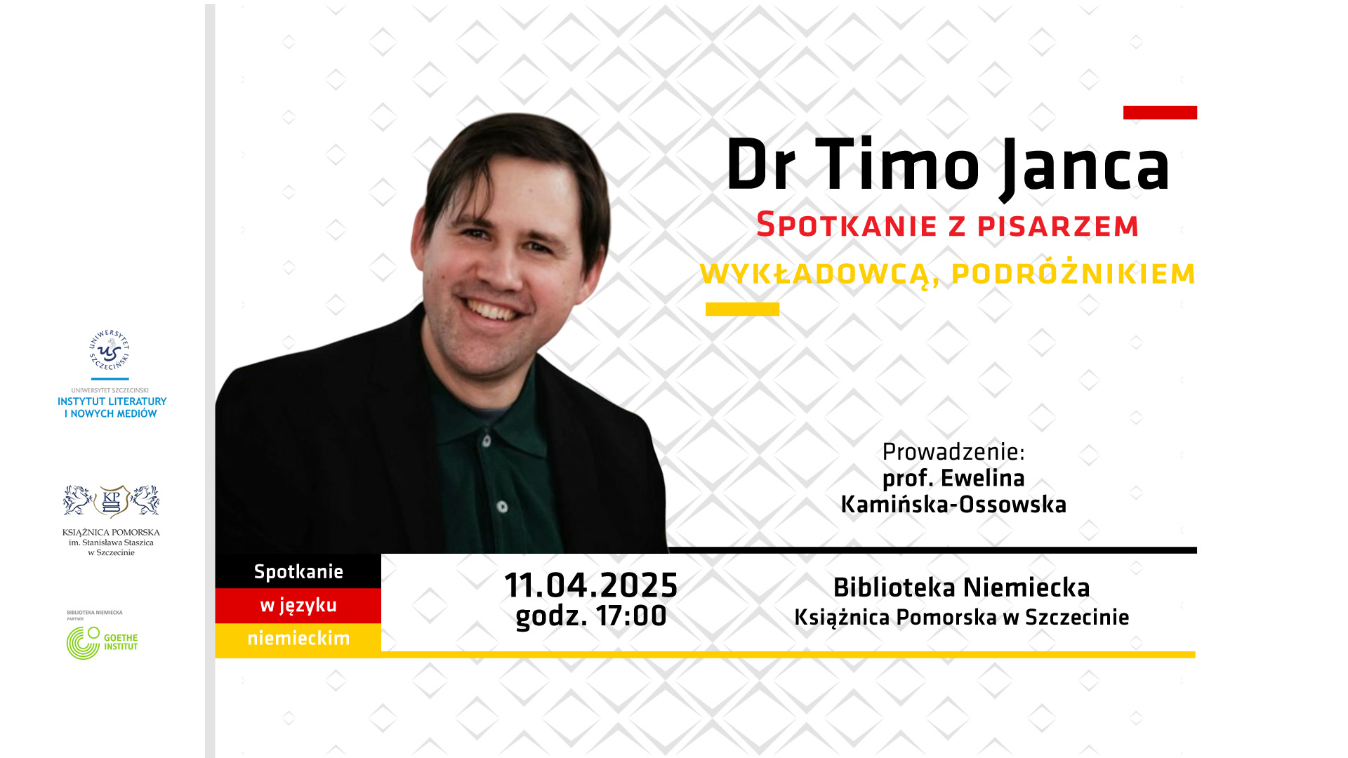 You are cordially invited to a meeting with writer Dr. Timo Janca. The author will talk about his work, as well as the possibilities of further education scholarships in Germany for lecturers, teachers and students of German studies. The meeting will be moderated by Professor Ewelina Kaminska-Ossowska of the Institute of Literature and New Media at the University of Szczecin.