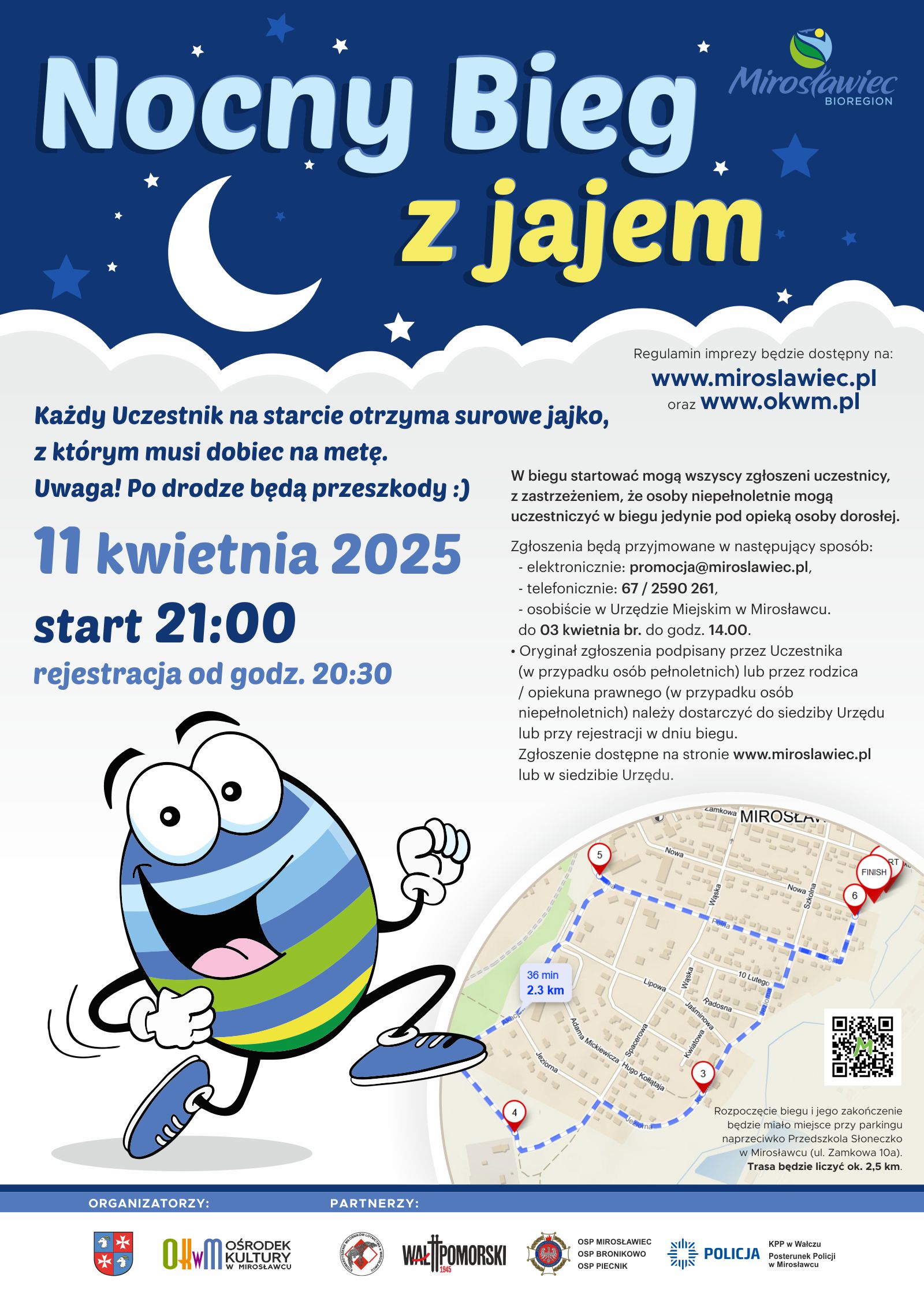 We invite you to the Night Egg Run, which will be held on April 11, 2025 start at 9 p.m. (registration until 8:30 p.m.) Each Participant at the start will receive a raw egg, with which he must run to the finish line. Note that there will be obstacles along the way.