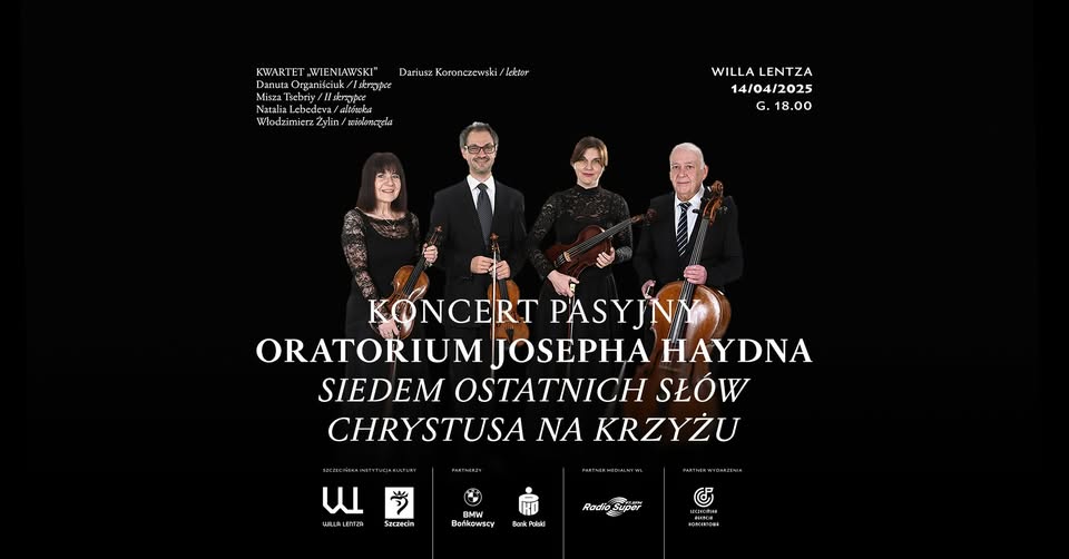 PASSION CONCERT OF JOSEPH HAYDN'S ORATORY SIX LAST WORDS OF CHRIST ON THE CROSS Date: April 14, 2025 (Monday) Time: 18:00 Place: Lentz Villa, Szczecin In an atmosphere of reflection and reverie, we will hear Joseph Haydn's moving oratorio - "Seven Last Words of Christ on the Cross". This extraordinary work will introduce listeners to the mystery of the Passion of Christ, and the music will be accompanied by the voice of the lector - Dariusz Koronczewski.