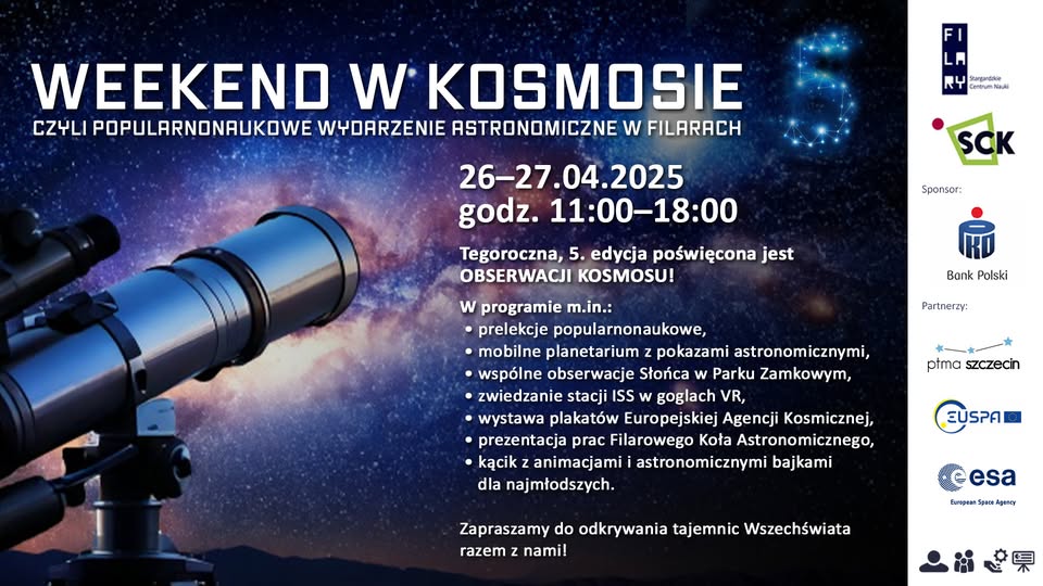 ✨ WEEKEND IN THE COSMOS ✨ 26-27.04.2025, 11:00 am - 6:00 pm, at the PILLARS We invite you to the 5th edition of our popular science astronomy event! This year we are focusing on OBSERVATION OF THE COSMOS - look into the sky and discover the amazing mysteries of the Universe! What awaits you? ???? Popular science lectures about the cosmos ???? Mobile planetarium with extraordinary shows ☀️ Joint observations of the Sun in Castle Park behind SCN ????️ Tour of the ISS in VR goggles ???? Exhibition of European Space Agency posters ⭐ Presentation of the work of the Pillar Astronomy Circle ???????? Corner with animations and astronomical fairy tales for the youngest Join us for a space adventure in Pillars Tickets priced: PLN 30 normal and PLN 20 concession, are now available at: https://bilety.scn-filary.pl and at the box office at 21 B. Chrobrego St. The ticket is valid all day from the hour for which it was purchased. In addition, in the SCN store it is possible to buy tickets with a discount for FKA and PTMA members with the presentation of an ID card. The sponsor of the event is PKO Bank Polski ????
