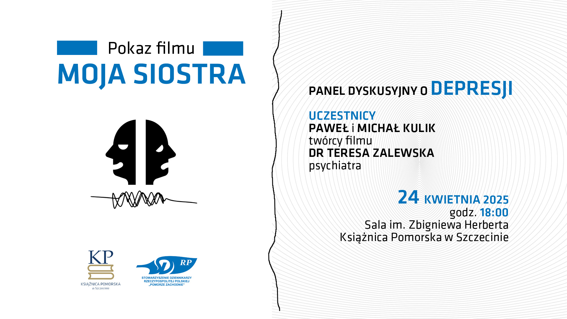 Książnica Pomorska and the Association of Journalists of the Republic of Western Pomerania invite you to a screening of the film "My Sister", combined with an expert panel discussion on depression, which will be attended by Pawel and Michal Kulik, creators of the film "My Sister", and Dr. Teresa Zalewska, a psychiatrist. About the film: The film tells the story of two sisters. The older of the two, Anna, is sensitive and calm, but withdrawn; she is slowly closing in on herself. She stops leaving the house, sleeps all day, doesn't eat. She falls into depression. The younger one tries to help her, although it becomes more difficult every day.Starring Bibianna Chimiak - an actress of the Kana Theater and dancer Eliza Holubowska.