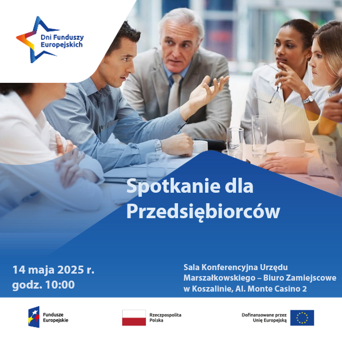 Local Information Point of European Funds in Koszalin invites you to participate in a stationary information meeting: "European Funds for Entrepreneurs".Those interested in participating are asked to send a completed application form by May 13, 2025 at 12:00 p.m. The form is available on the website: fundsue.wzp.pl under the Events tab. Participation in the meeting is free of charge - the order of registration is decisive. In the case of persons with disabilities, please inform the organizer of their special needs. This will enable the preparation of appropriate assistance, as well as the efficient handling of the meeting.