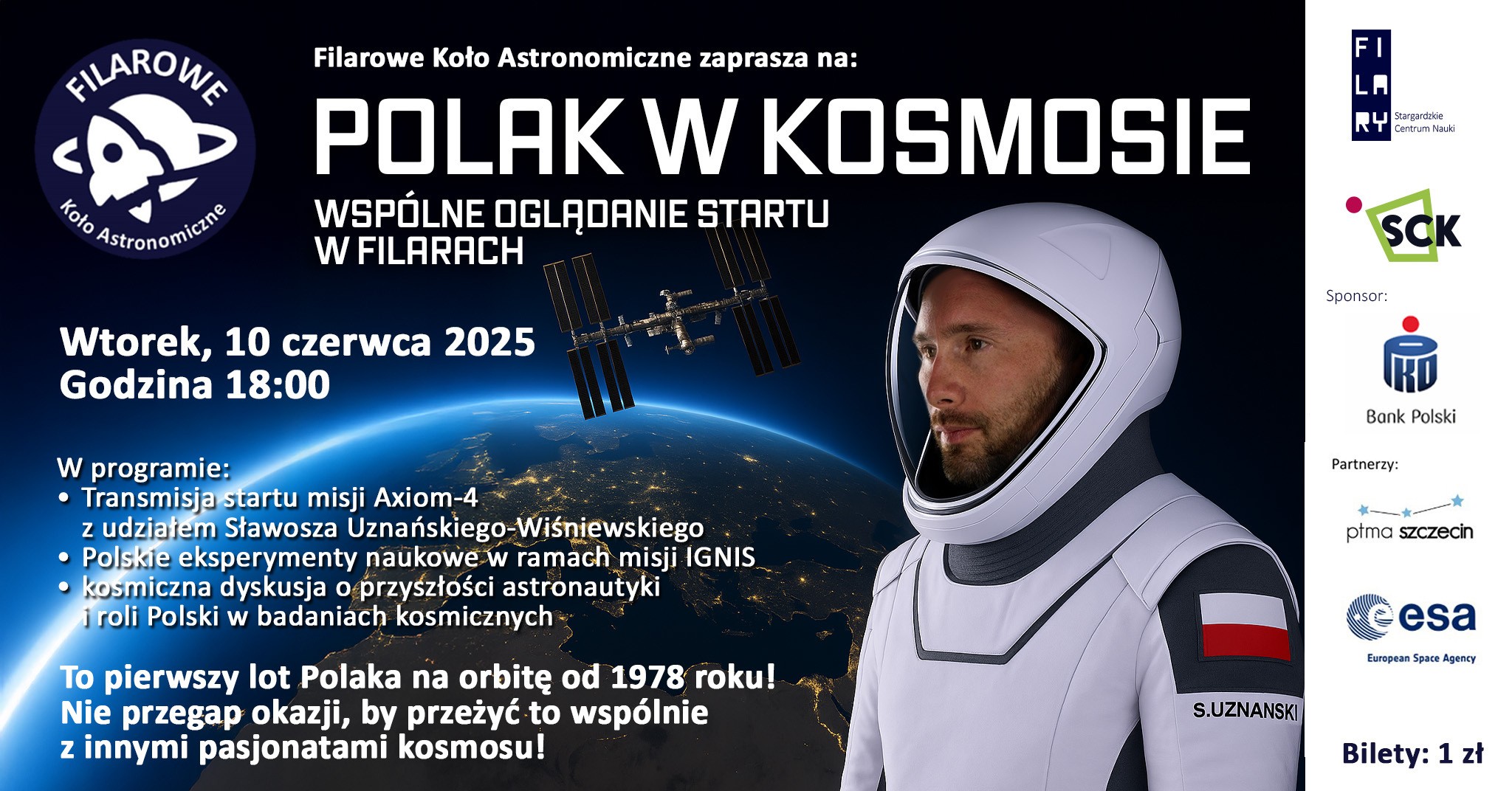 A Pole is going into space again! On Tuesday, June 10, a SpaceX rocket with the Axiom-4 mission will take off from Cape Canaveral, and Slawosz Uzenski-Wisniewski, a Polish astronaut who will fly to the International Space Station, will be on board! The Pillar Astronomy Circle invites you to a unique event: a Pole in space - watching the launch together in Pillars On the program: ???? broadcast of the launch of the Axiom-4 mission ???? presentation of the Polish science and technology mission IGNIS ???? discussion about the experiments that Slawosz Uznański-Wiśniewski will conduct on the ISS ???? discussion on the future of astronautics and Poland's role in space exploration This is the first flight of a Pole to orbit since 1978 - don't miss the opportunity to experience it together with other space enthusiasts! ???? Tuesday, June 10, 2025 ???? Hour 18:00 ???? Stargard Science Center Pillars ???? Ticket: 1 PLN