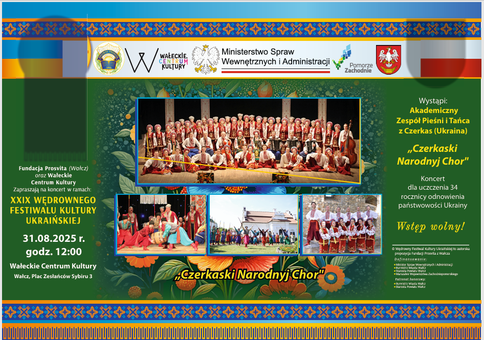 The Prosvita Foundation and the Wałcz Cultural Center invite you to a concert by the Academic Song and Dance Ensemble "Czerkaski Narodnyj Chor," which will take place on August 31 at 12:00 p.m. in the WCK auditorium. Admission is free.