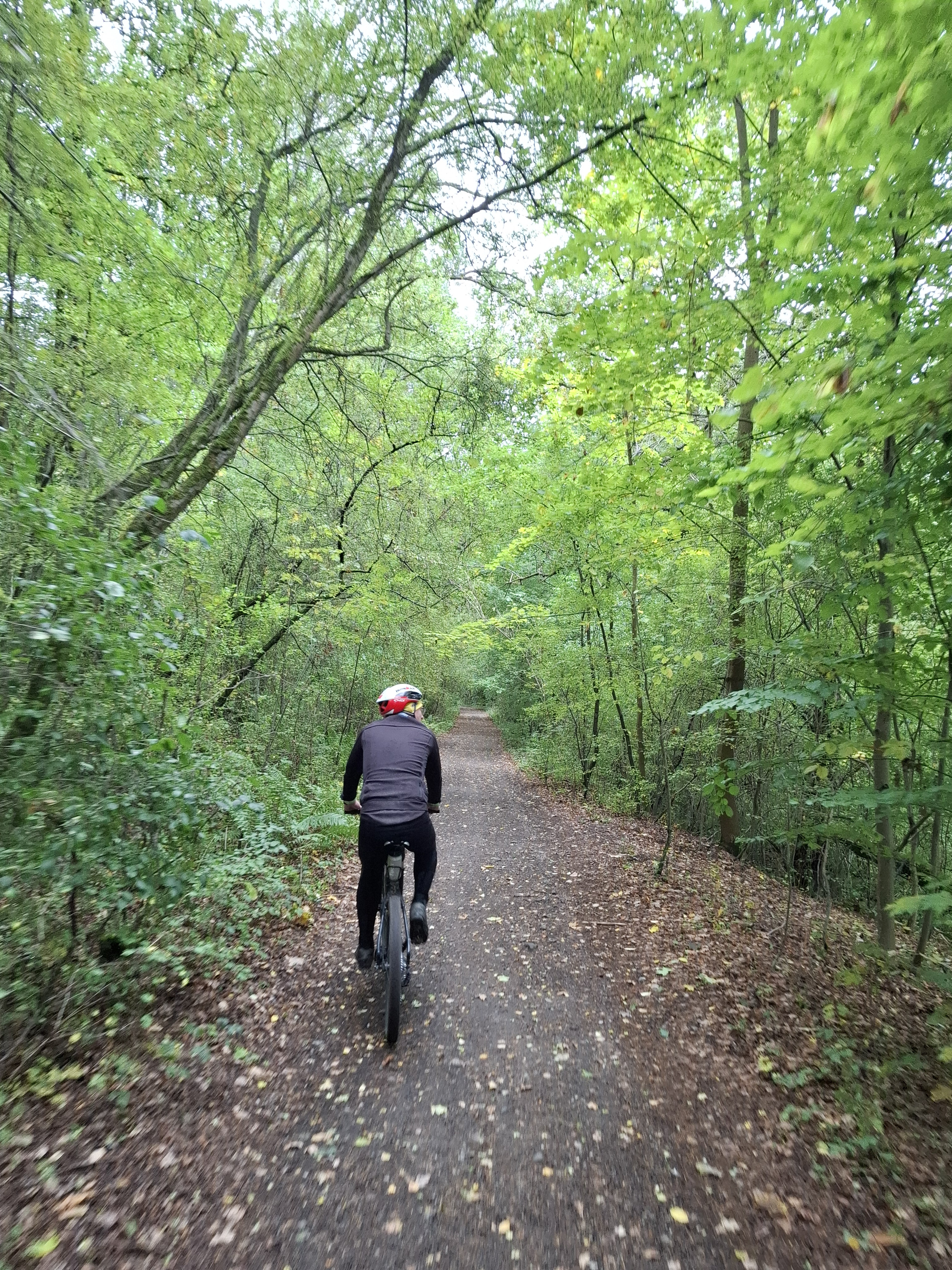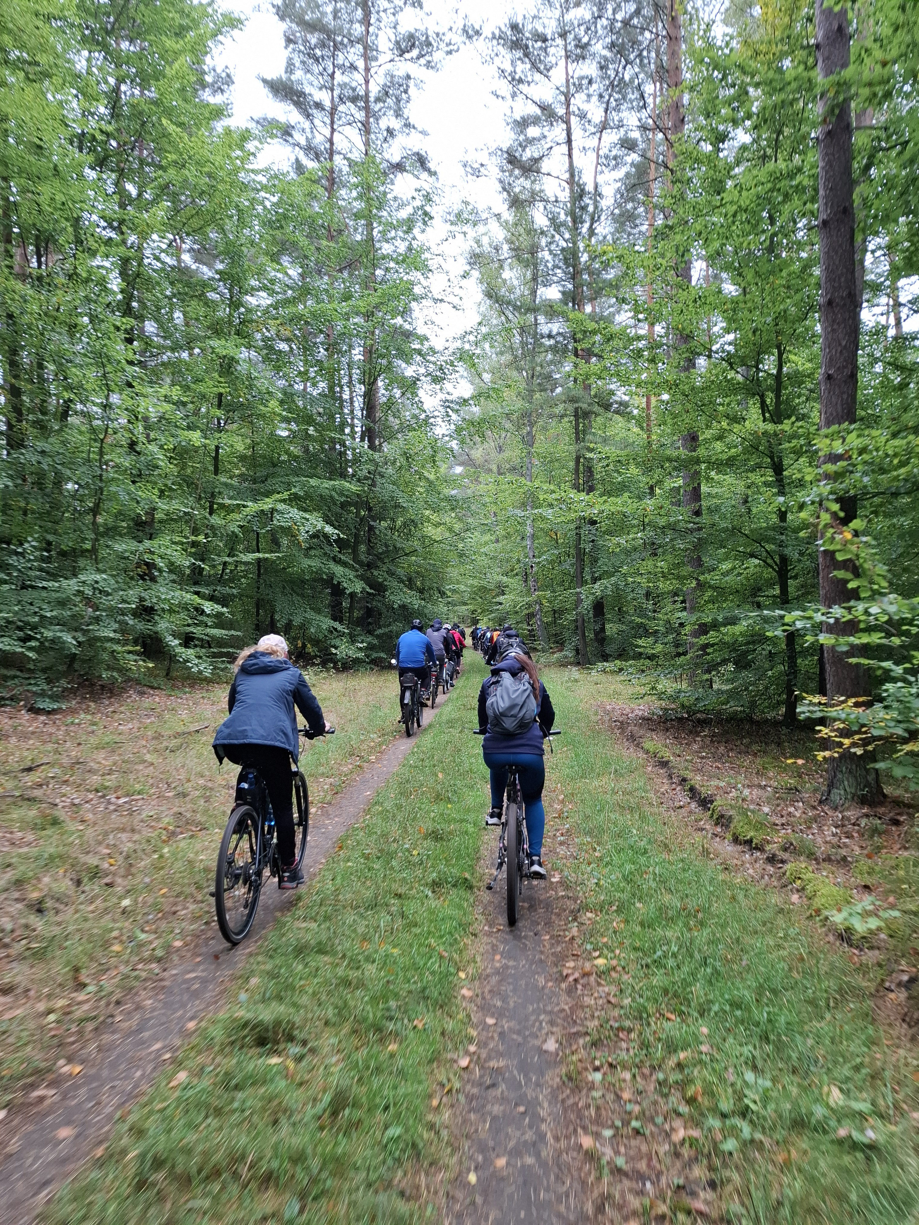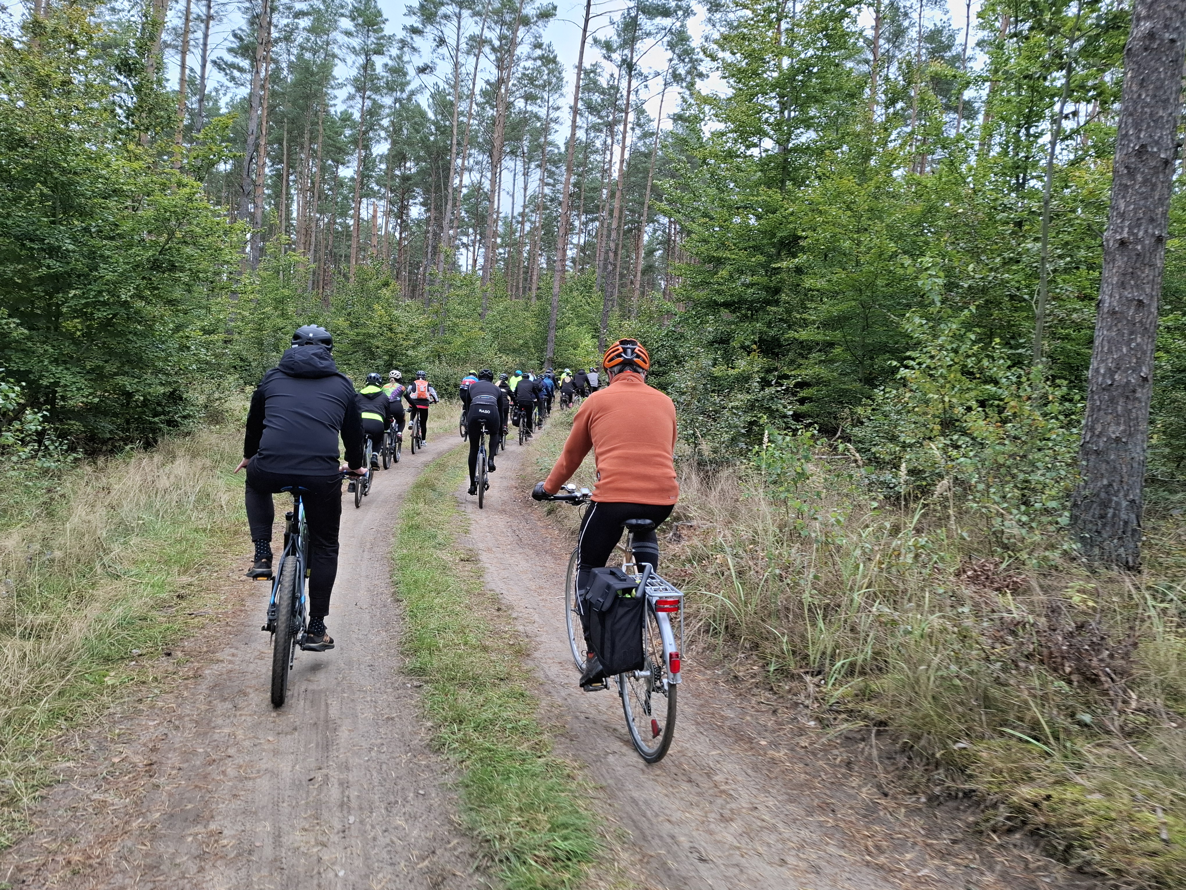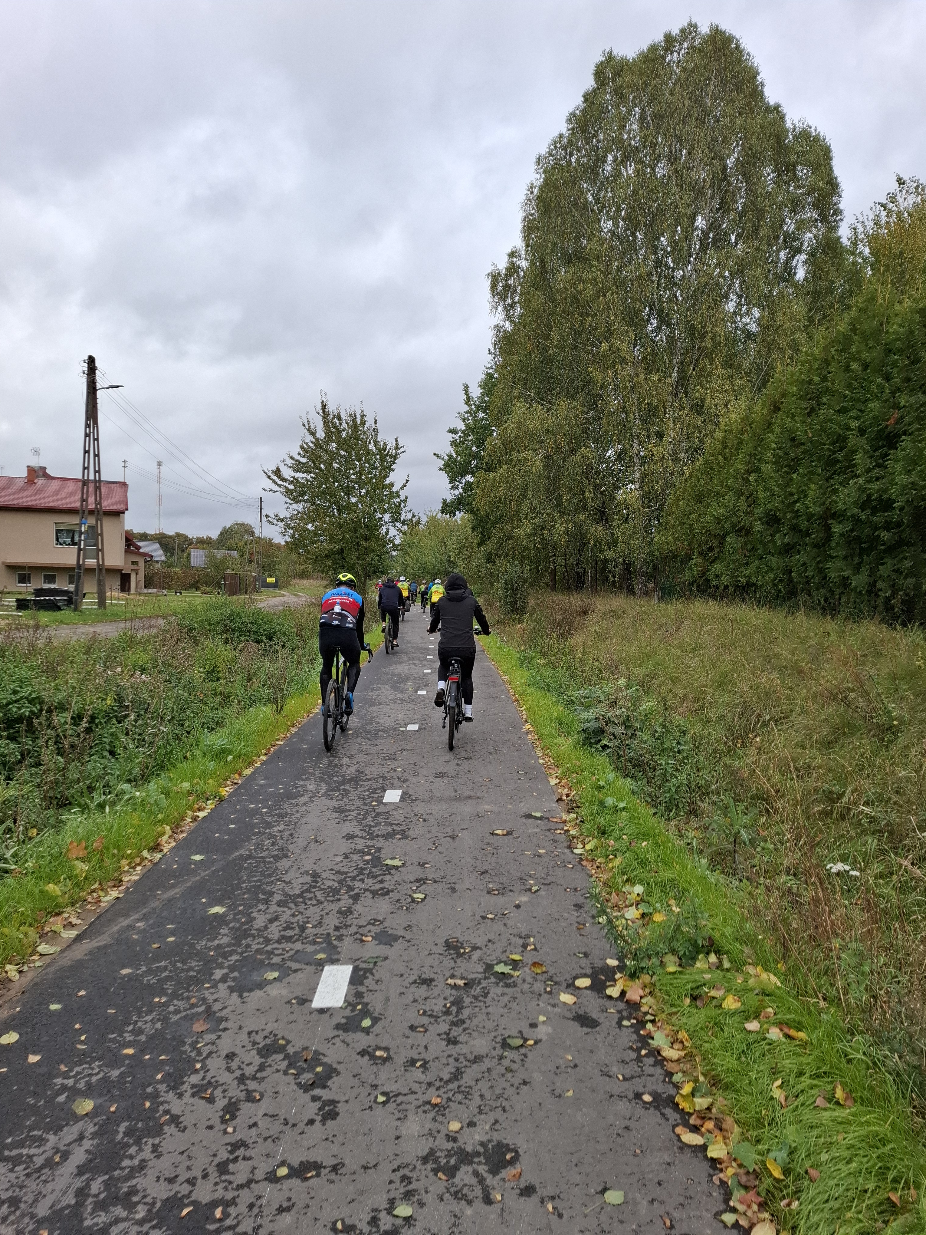 The route leads picturesquely through a section of the Old Railway Trail, local roads with little traffic and quiet forest fire roads. It is a loop, so you can start riding anywhere — we set off from the Kłosowski suspension bridge, heading along the shore of Lake Raduń towards the Old Railway Trail.