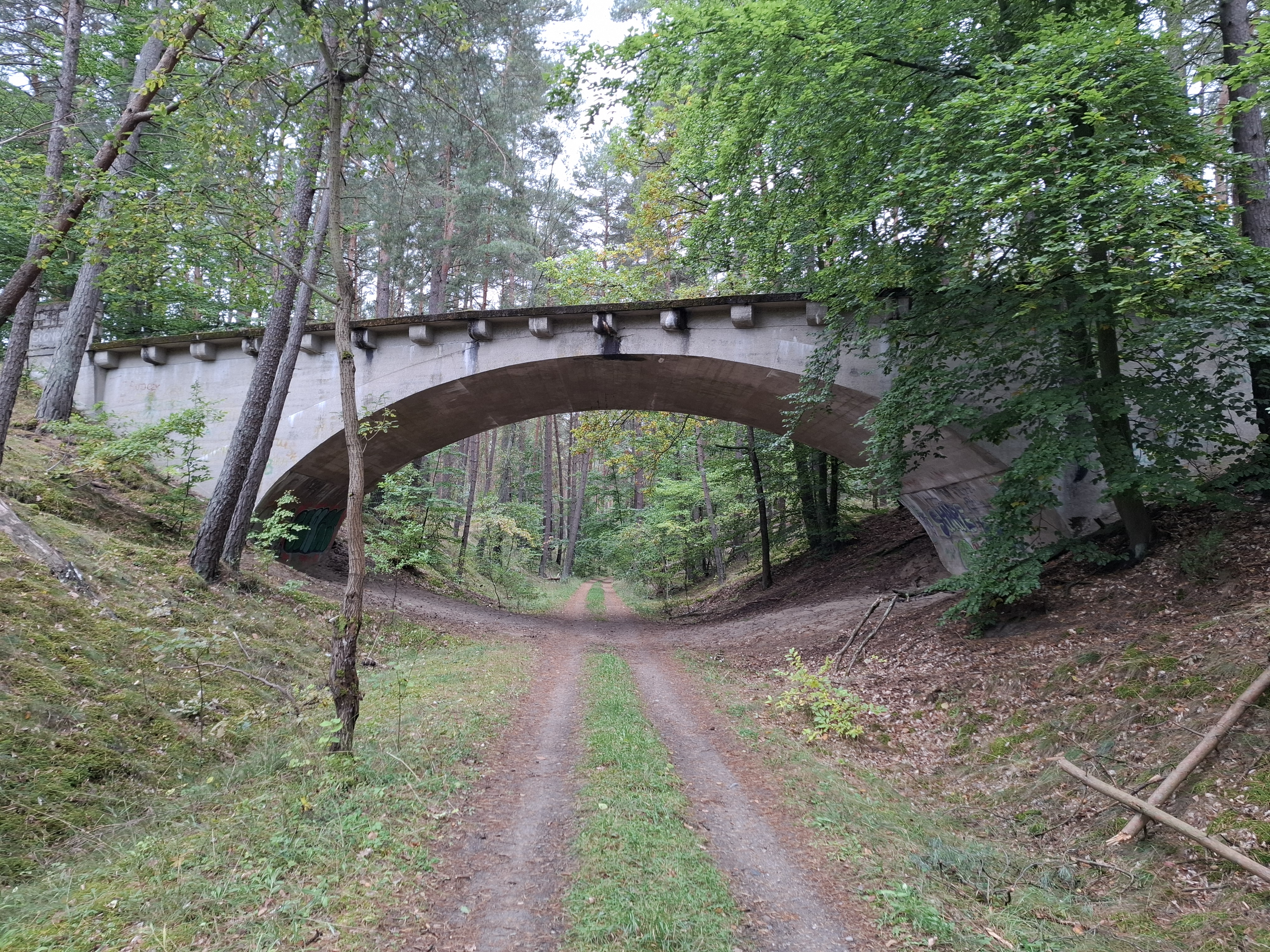 From Zdbice, the route leads to Ostrowiec along forest fire road No. 2. In this village, we cross provincial road No. 22 and then enter the former railway embankment leading towards Wałcz. This section is exceptionally picturesque — we pass the remains of two bridges, the lakes Chmielno Małe and Chmielno Duże, and the Cegielnia Fortification Group, where it is worth planning a longer stop for sightseeing. There is a complex of well-preserved fortifications of the Pomeranian Wall — bunkers, shelters and corridors, which allow you to see a fragment of World War II history up close and learn about the scale and nature of the region's former fortifications.
