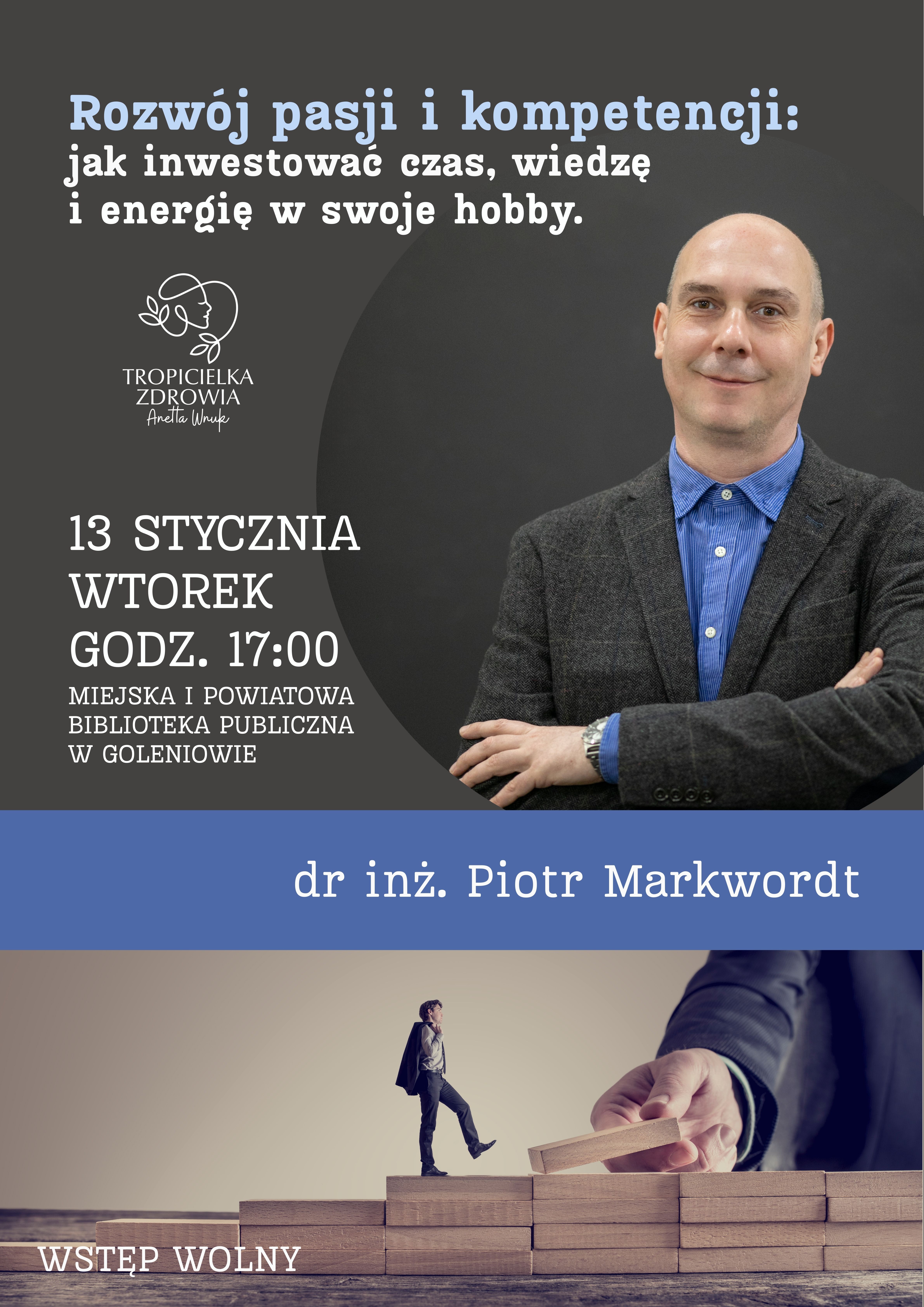 The Municipal and District Public Library in Goleniów, together with Health Tracker Anetta Wnuk, invite you to a meeting entitled "Developing passions and skills: how to invest time, knowledge, and energy in your hobbies," which will take place on January 13 at 5:00 p.m. at the library. The meeting will be led by Dr. Piotr Markwordt.