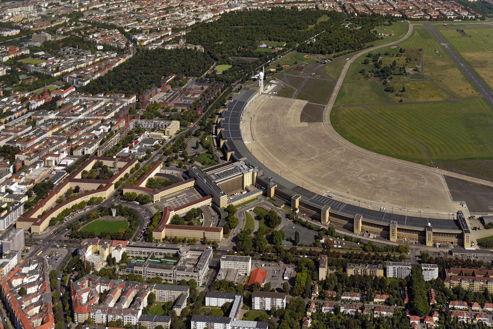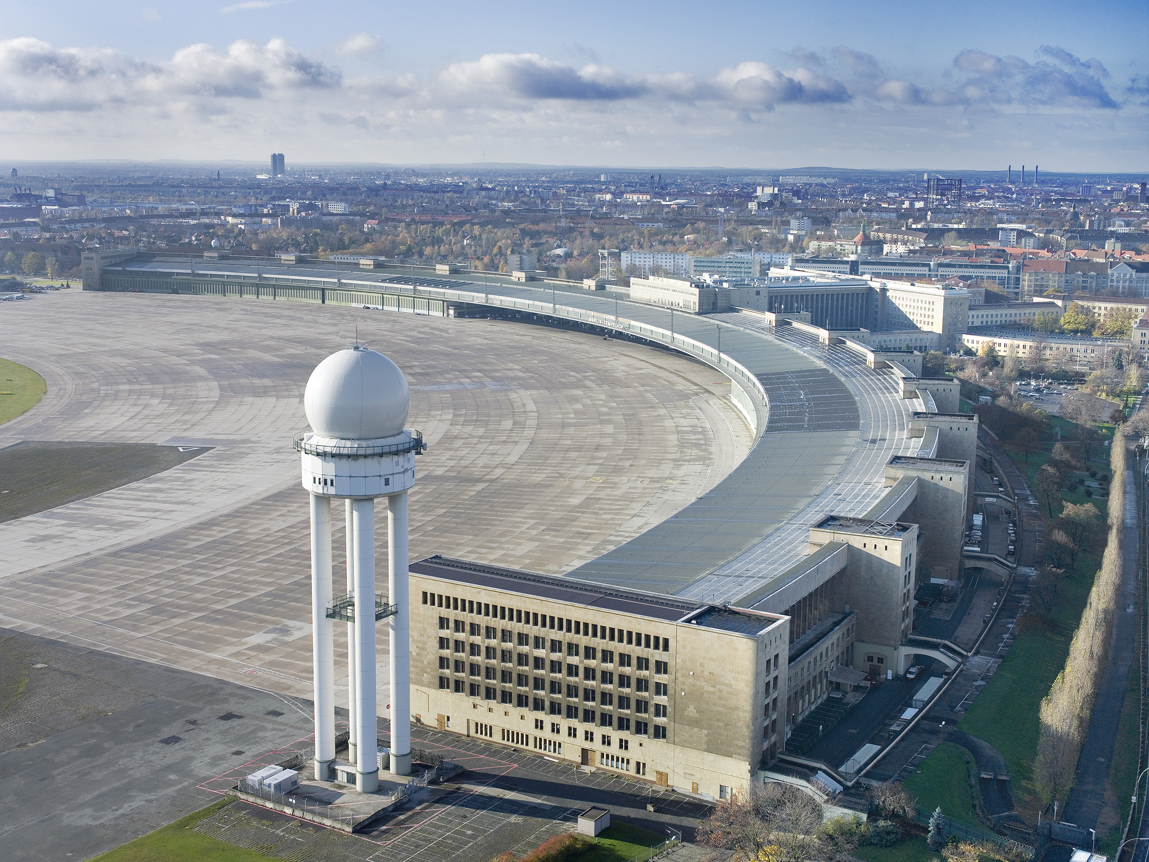 The complex consists of the ellipse of the airfield and the enormous building complex. This consists of a sequence of symmetrically arranged components: a courtyard flanked by office wings, the reception building with the departure hall behind it. The buildings are completed by the 1,230-meter-long arch of the hangars, divided by stair towers, with the covered pier in the middle. With around 7,300 rooms, the building has the dimensions of a small town.