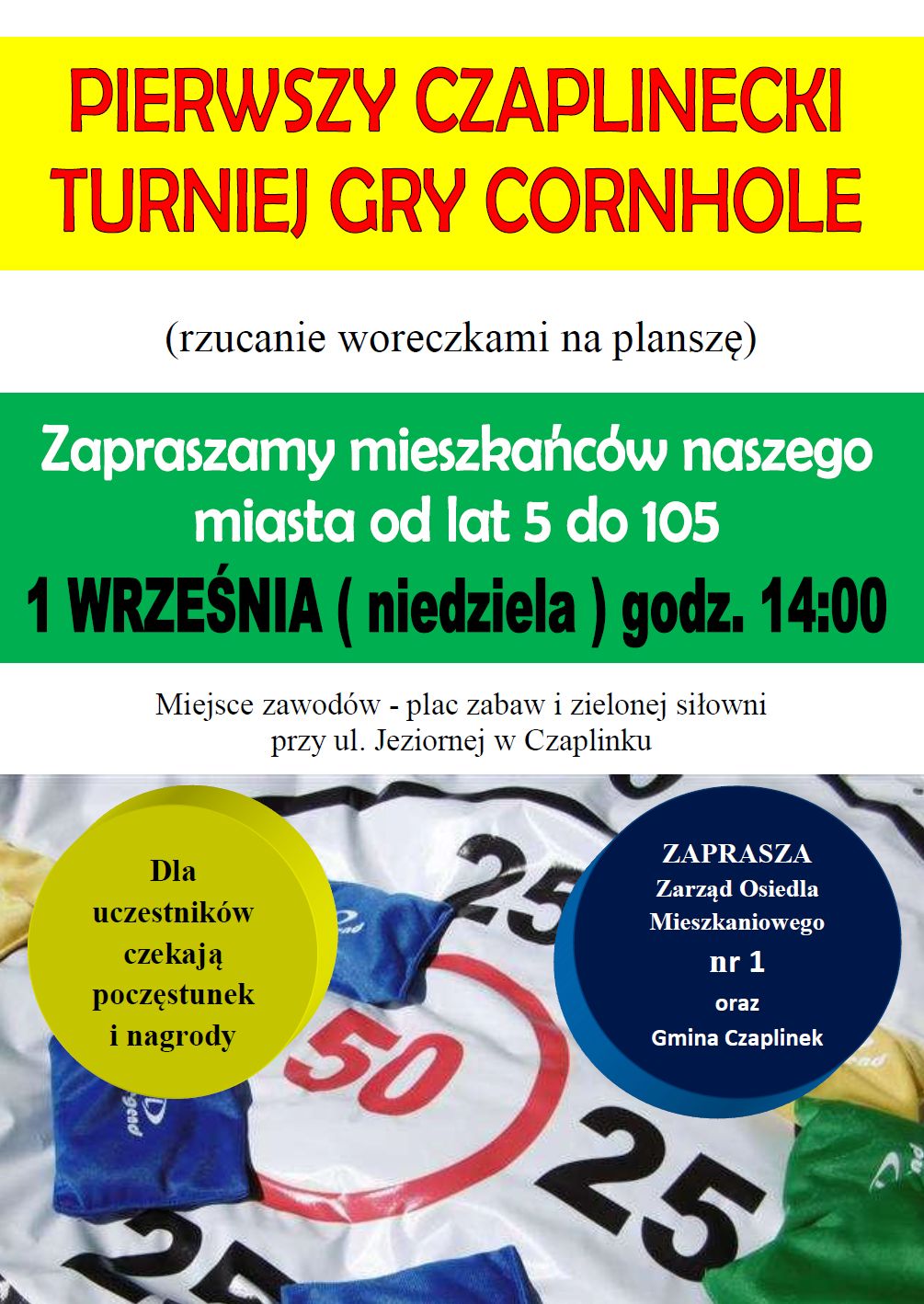 The Management Board of Housing Estate No. 1 invites you to the First Czaplinek Cornhole Game Tournament, which will be held on September 1, 2024 at the playground and green gym on Jeziorna Street in Czaplinek.