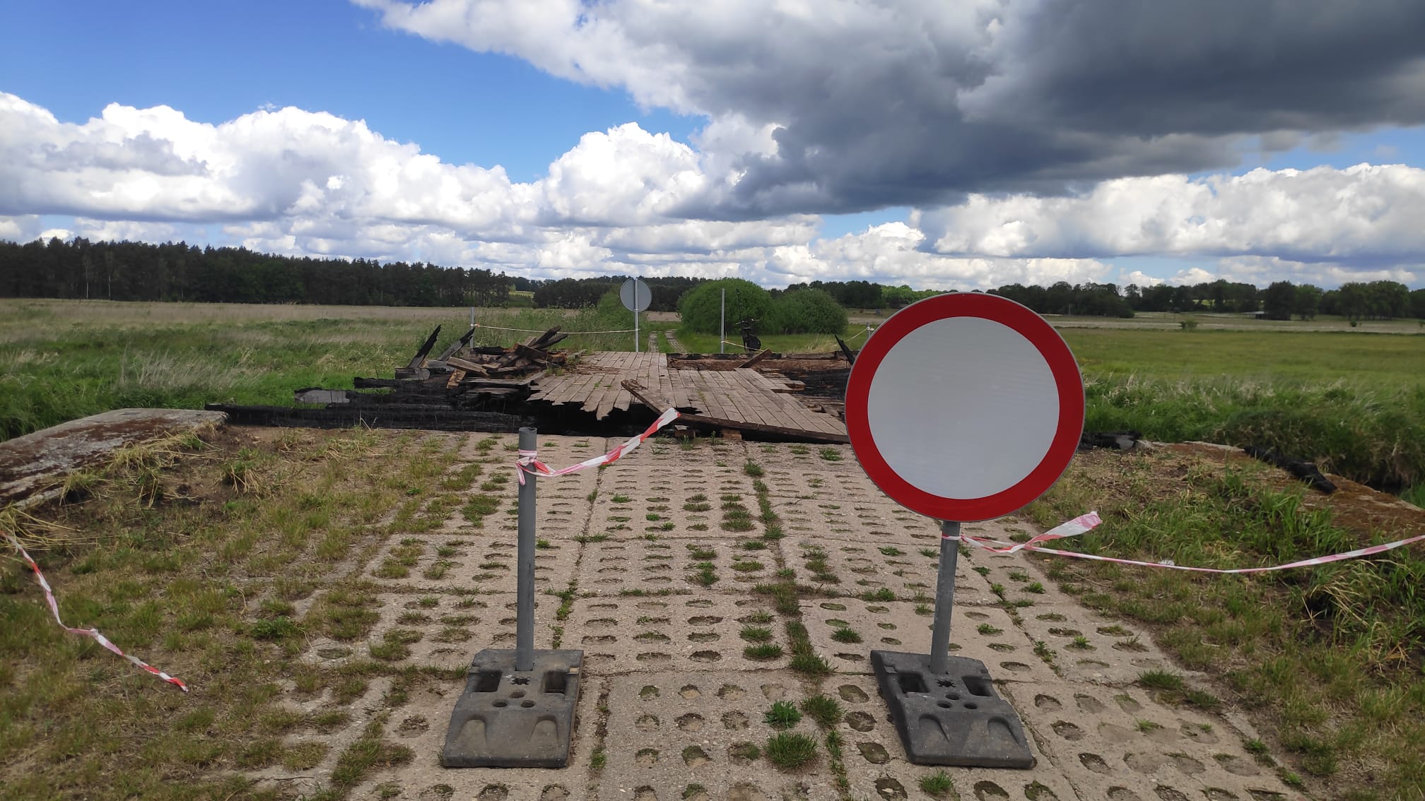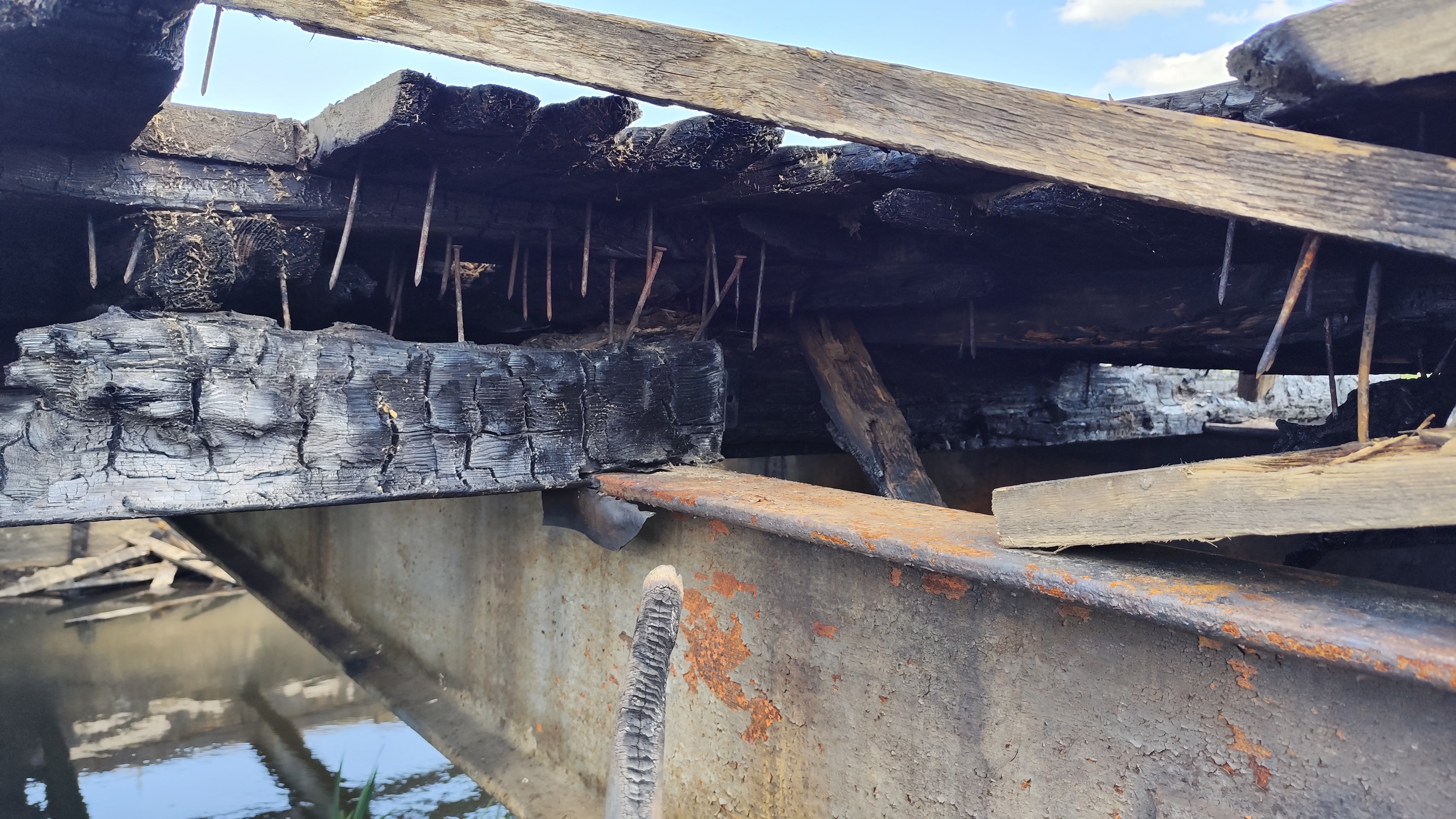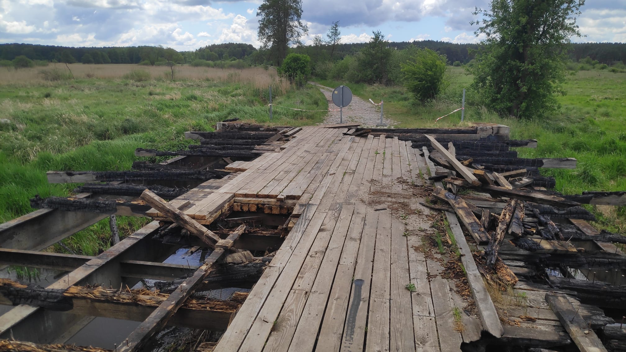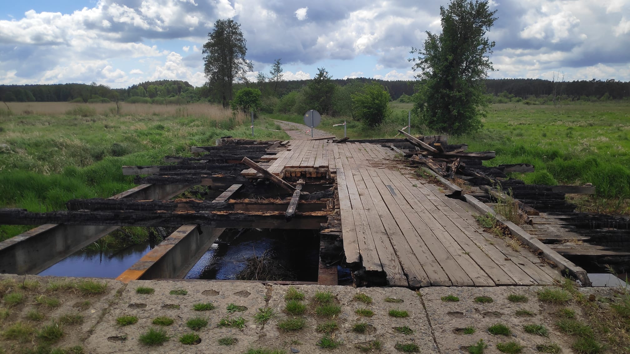 Міст через річку Іна, між Славецином і Носово, знищений пожежею.