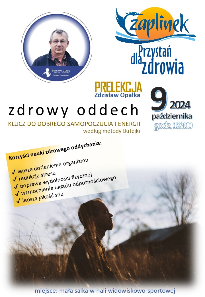 Запрошуємо на лекцію на тему. "Здорове дихання - ключ до гарного самопочуття та енергії за методом Бутейка", яку проведе Здіслав Опалка. Захід відбудеться 9 жовтня 2024 року о 18:00 у невеликій кімнаті в Спортивно-розважальному залі в Чаплінеку.